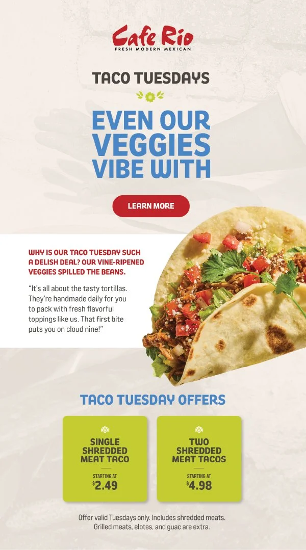 Cafe Rio was introducing a Taco Tuesday deal in their Utah market and they needed to spread the word. The client fell head over heels for our idea to personify taco ingredients—and we ran with it. Check out a few of the assets from the campaign below!